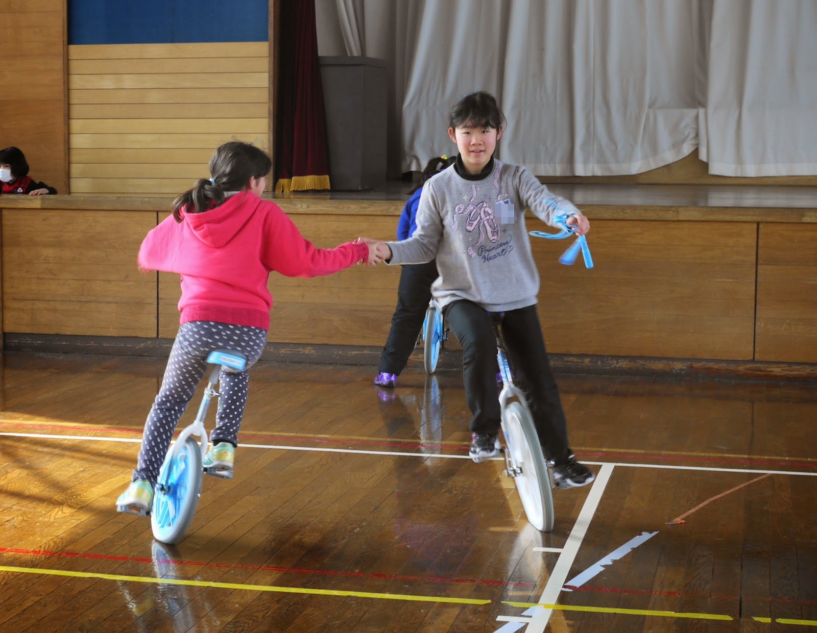 昼休みの体育館は3,4年生。バックで進むこともできるようになっていました。